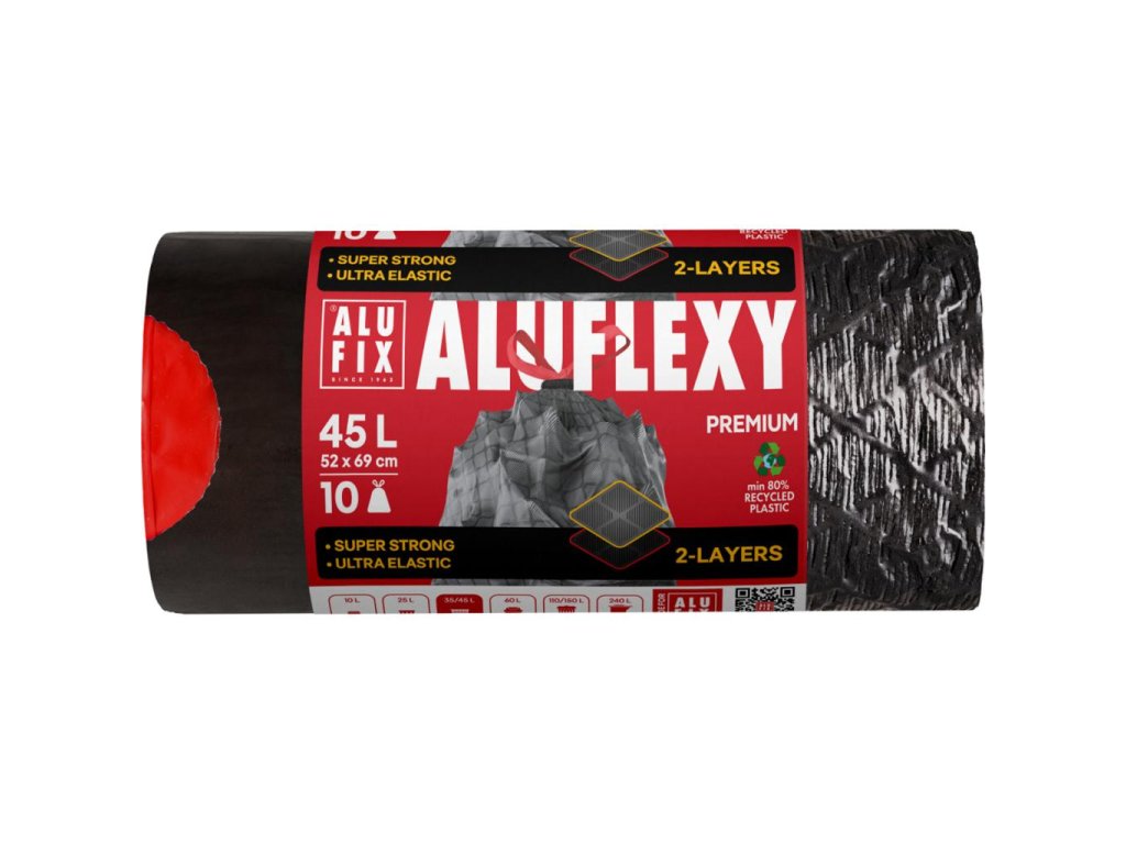 Vrecia na odpad Aluflexy zaťahovacie 45l, 10ks na rolke, hrúbka 30mikrónov, rozmer 52x69cm, sivo - čierne , 2 vrstvové odolné a pružné vrece, materiál LDPE