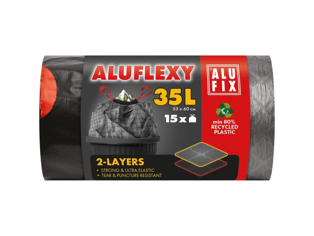 Vrecia na odpad, unikátne, flexibilné, 2 vrstvové, čierna vrstva - taška silná, extra elastická, strieborná vrstva - odolná voči roztrhnutiu a prepichnutiu. Nosnosť odpadu 21 kg. LDPE, 53 x 60 cm, 15 kusov na rolke, 28 mikrónov.