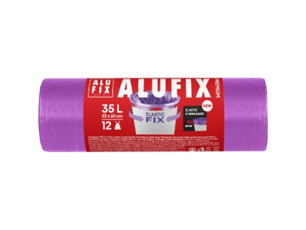 Vrecia na odpad Elastic Fix zaťahovacie s pružnou zaťahovacou páskou, ktorá vrece pevne udrží na odpakovom koši, 35l 12ks na rolke, rozmer 53x60cm, hrúbka 22mikrónov, fialové, materiál LDPE