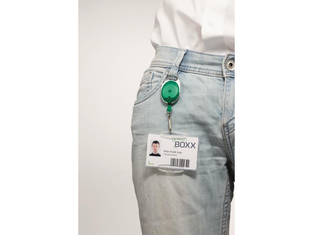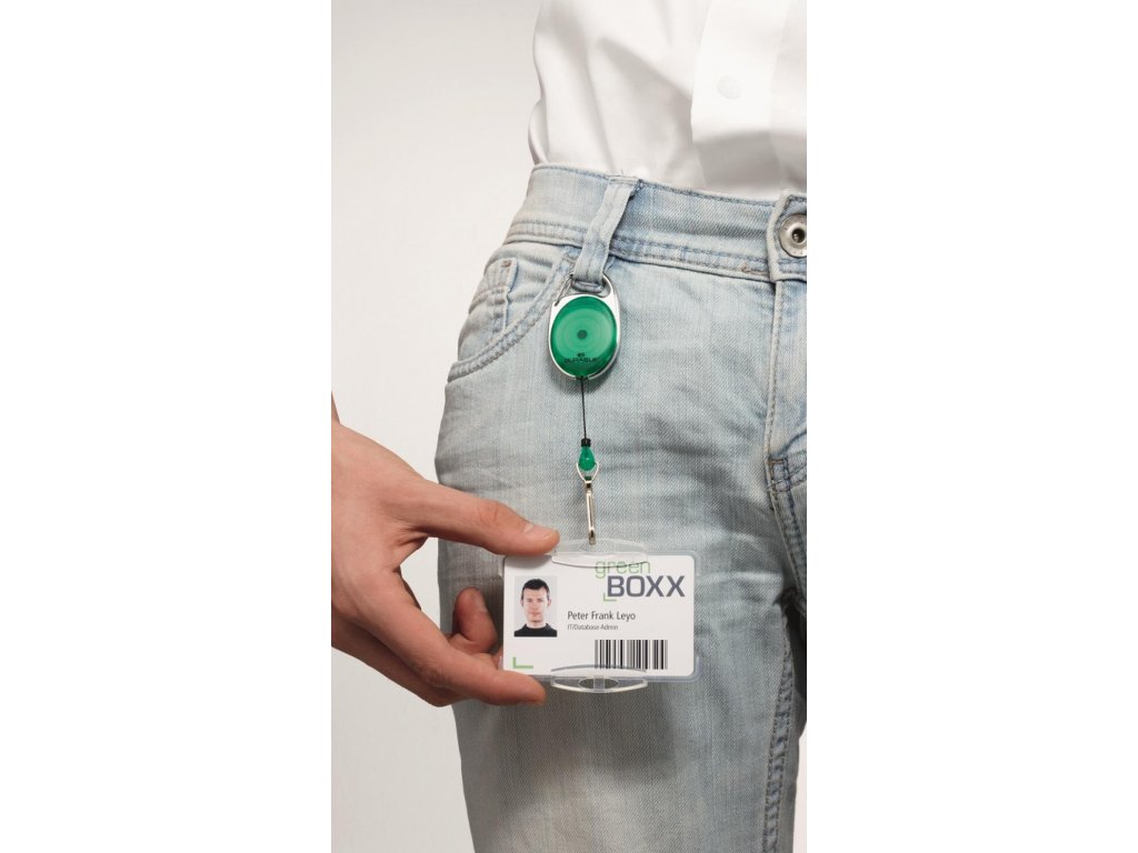 Štýlový kotúč s oválnym farebným telom a kovovým klipom so svorkou poskytuje rýchlu a jednoduchú manipuláciu s visačkou, príp.kartou. Vysunutie kotúča do dĺžky 80 cm. Dodávaný bez visačky. Farba zelená.