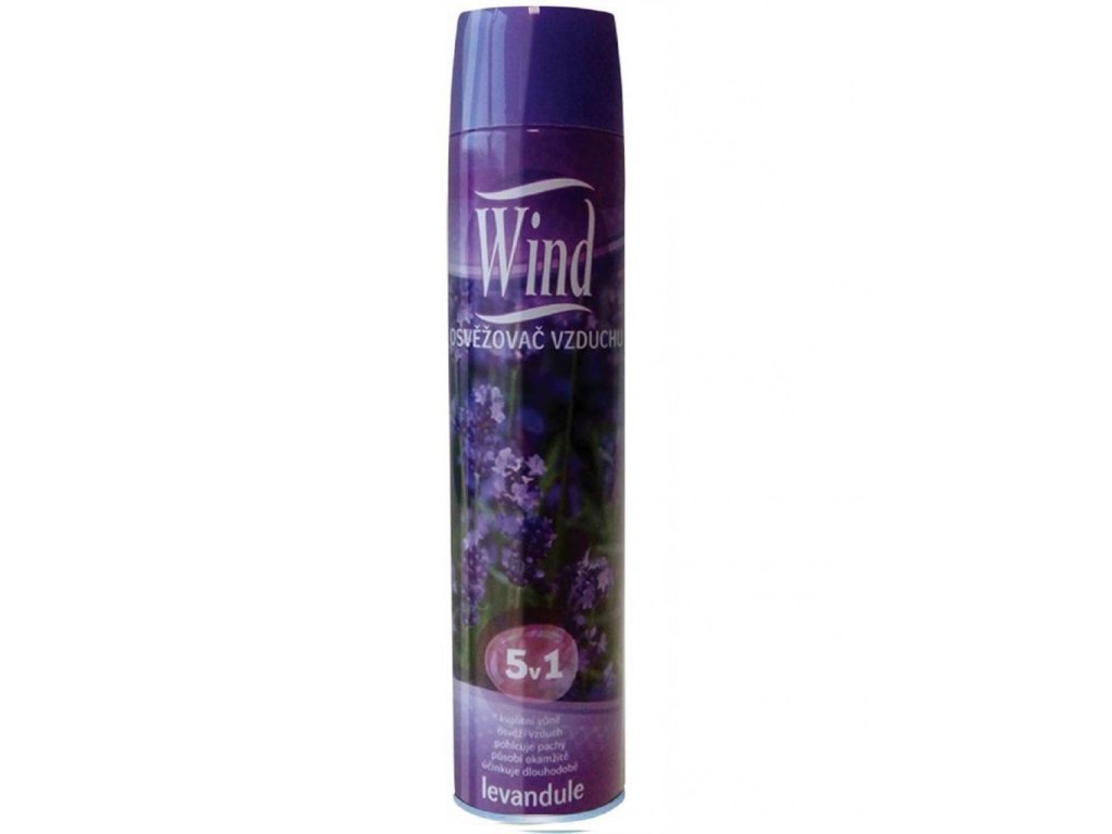 Osviežovač vzduchu Wind v spreji s neutralizérom pachov. Aerosol rychle a účinne osvieži vzduch vôňou Levandule.