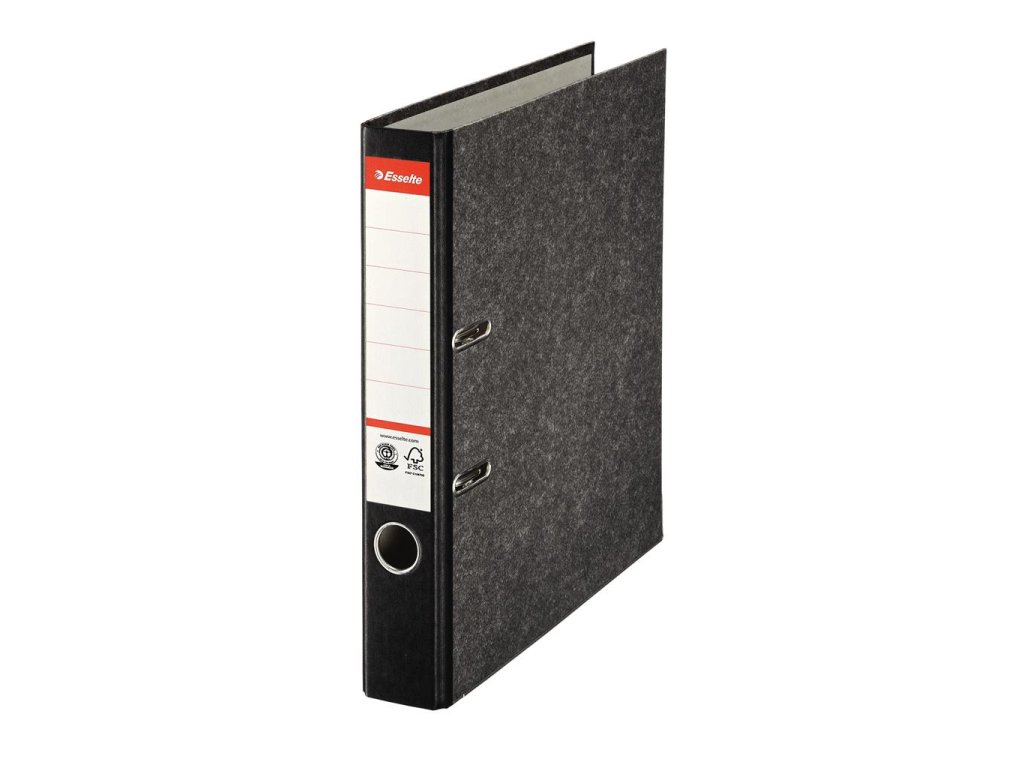 Štruktúrovaný papierový poťah s čiernym mramorovým vzorom, formát A4. Zakladač vybavený rado zámkom a nalepeným chrbtovým štítkom. Páková mechanika v dizajne MATT s prítlačnou lištou. Šírka chrbta 5 cm. Balenie 25 ks.