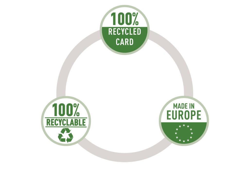 Klimaticky neutrálny, 100% recyklovaná lepenka, 100% recyklovateľná, s ekologickou certifikáciou Blue Angel a FSC