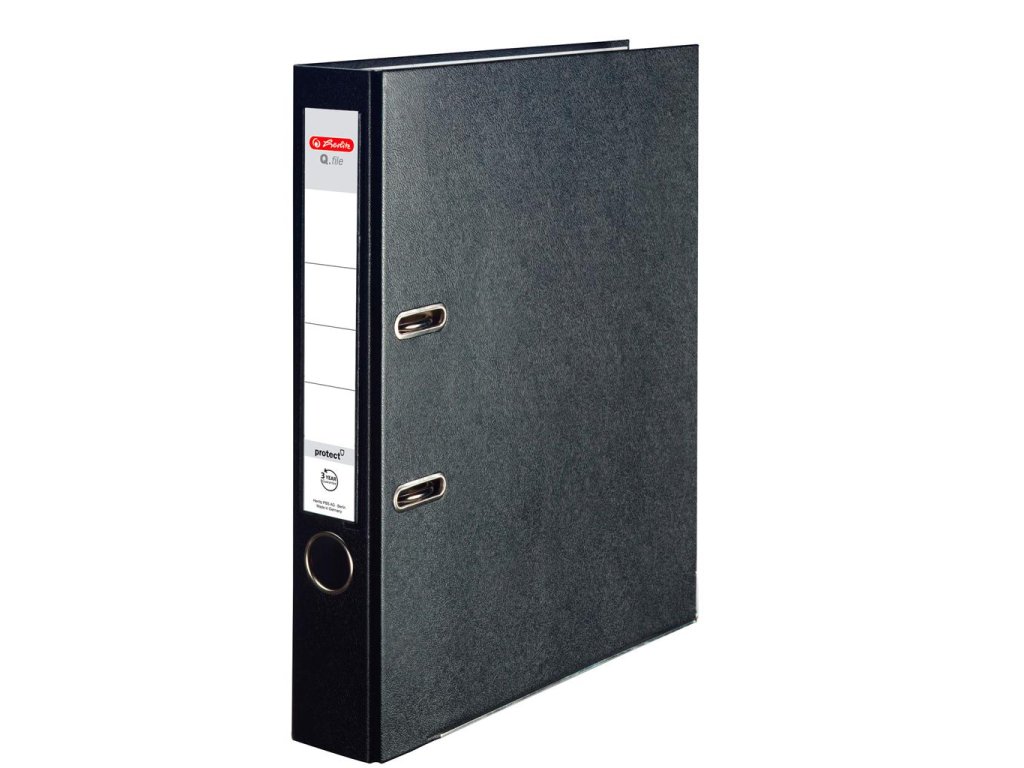 Pákový zakladač Q.file protect formátu A4. Šírka chrbta 5 cm. Materiál polypropylén, zásuvné vrecko, vnútorný biely podlep, lepenka 2mm, otvor na zadnej strane a radokrúžok pre lepšiu manipuláciu, kovová lišta. Farba čierna. Balenie 25 ks.