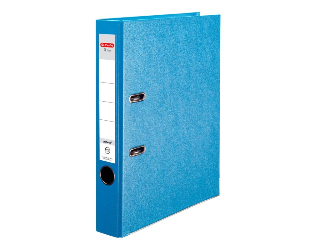 Pákový zakladač Q.file protect formátu A4. Šírka chrbta 5 cm. Materiál polypropylén, zásuvné vrecko, vnútorný biely podlep, lepenka 2mm, otvor na zadnej strane a radokrúžok pre lepšiu manipuláciu, kovová lišta. Farba svetlomodrá. Balenie 25 ks.