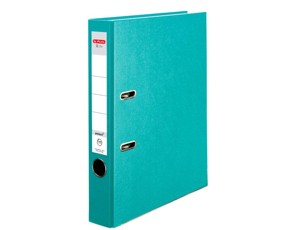 Pákový zakladač Q.file protect formátu A4. Šírka chrbta 5 cm. Materiál polypropylén, zásuvné vrecko, vnútorný biely podlep, lepenka 2mm, otvor na zadnej strane a radokrúžok pre lepšiu manipuláciu, kovová lišta. Farba tyrkysová. Balenie 25 ks.