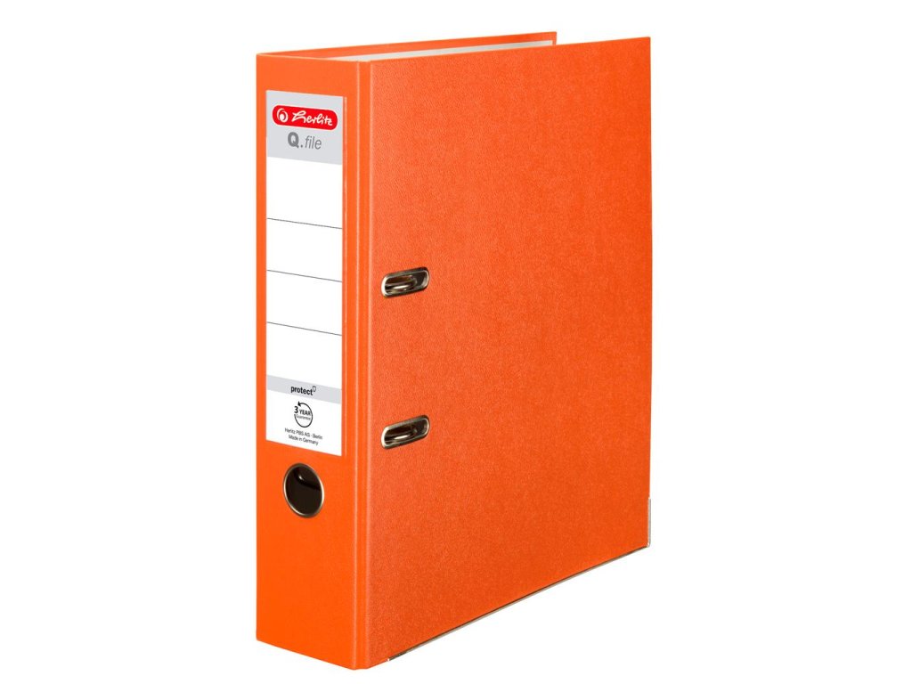 Pákový zakladač Q.file protect formátu A4. Šírka chrbta 8cm. Materiál polypropylén, zásuvné vrecko, vnútorný biely podlep, lepenka 2mm, otvor na zadnej strane a radokrúžok pre lepšiu manipuláciu, kovová lišta. Farba oranžová. Väčšie balenie 20 ks.