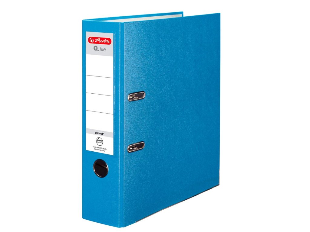 Pákový zakladač Q.file protect formátu A4. Šírka chrbta 8cm. Materiál polypropylén, zásuvné vrecko, vnútorný biely podlep, lepenka 2mm, otvor na zadnej strane a radokrúžok pre lepšiu manipuláciu, kovová lišta. Farba svetlomodrá. Väčšie balenie 20 ks.