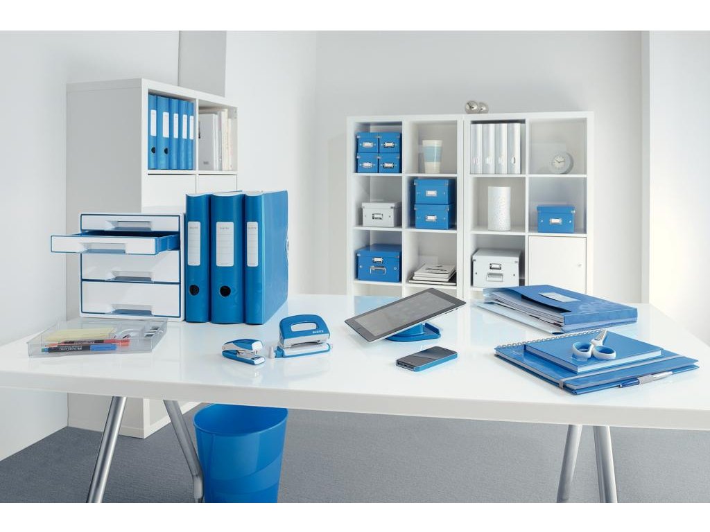 Inovatívny mobilný zakladač v žiarivých WOW farbách s dvojfarebným efektom. Dvojvrstvový PP materiál vyplnený penou z tzv. Polyfoamu, ktorý je extrémne odolný a ľahký. Unikátna páková mechanika s otvorením o 180°, ktorá umožňuje o 50 % širšie otvorenie a o 20 % rýchlejšiu prácu so zoraďovačom. Praktické uzatváranie zoraďovača na gumičku pre bezpečný prenos. Vnútorný obal na voľné papiere, CD/DVD a vizitky. Zaoblený chrbát a praktická úchytka na pero pre pohodlné mobilné použitie. Šírka chrbta 7,5 cm, kapacita 500 listov A4 (80 g/m²). Farba modrá.