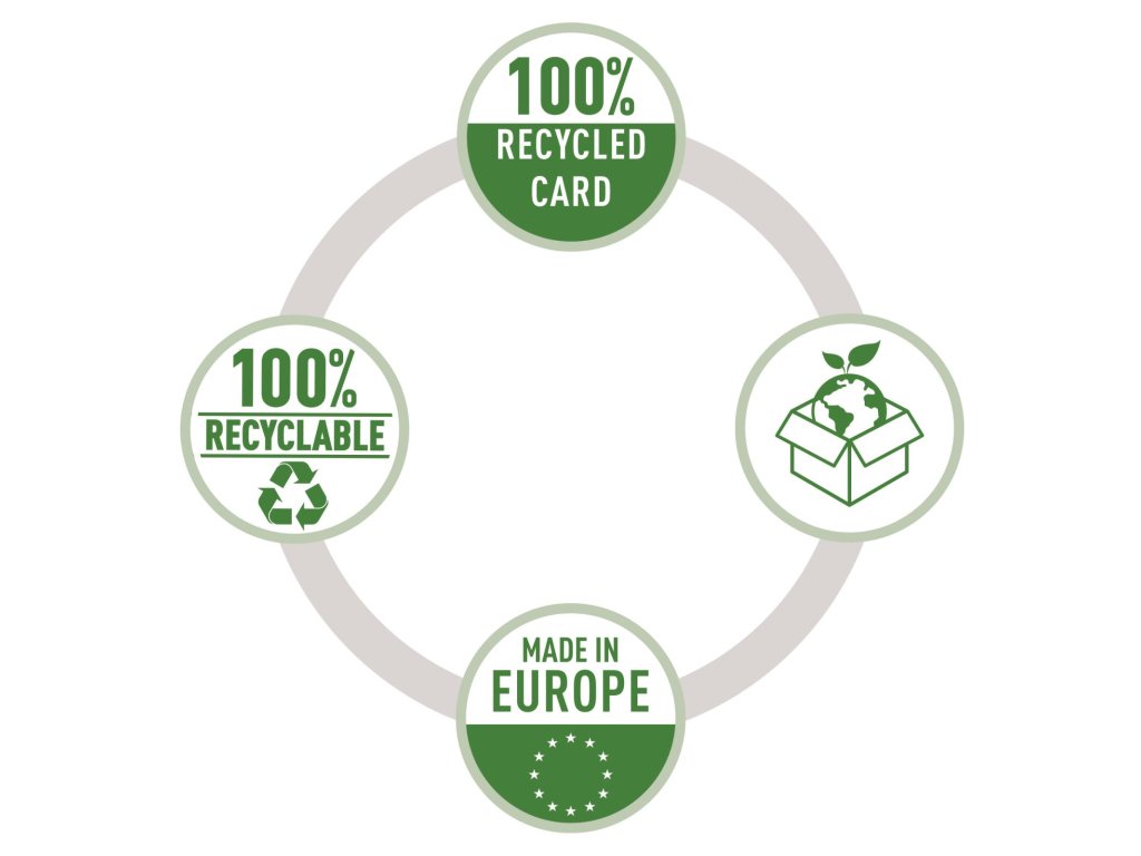 100% je možné recyklovať, klimaticky neutrálne, v súlade so štandardom Blue Angel a FSC