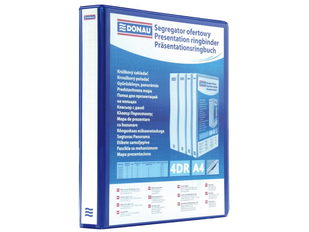 4-krúžkový celoplastový zakladač A4 s D-krúžkom, predným, zadným a chrbtovým priehľadným vreckom. Farba modrá. Šírka chrbta 3,7 cm.