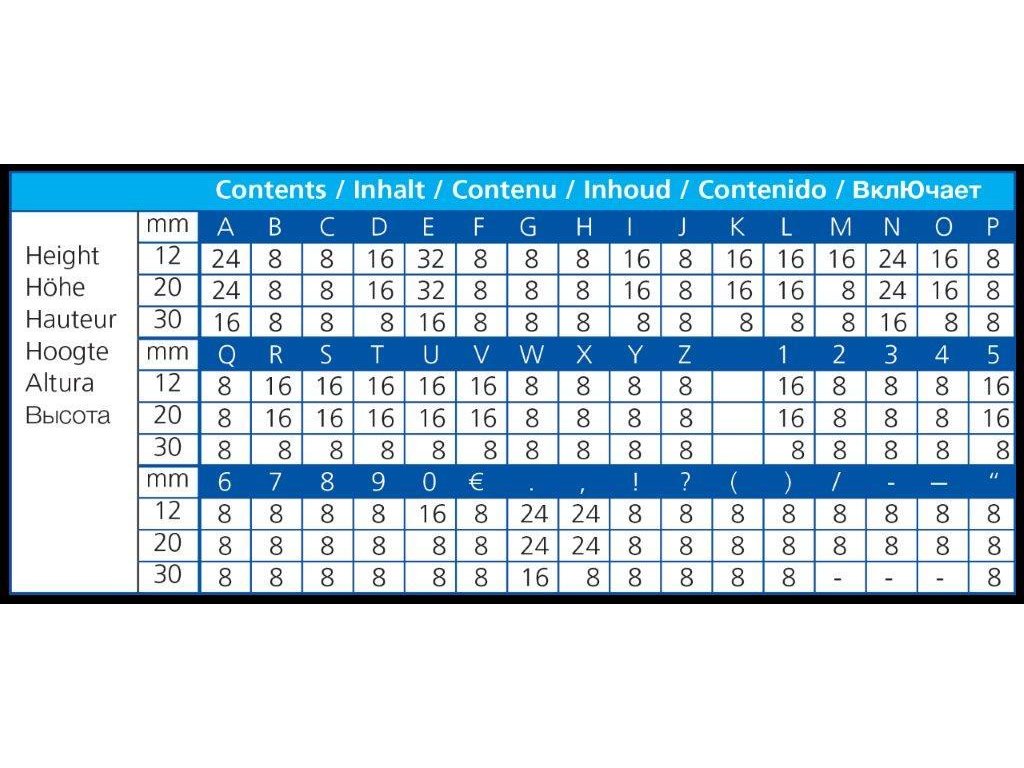 Biele plastové písmená, číslice a znaky k informačným tabuliam. Krabica so samostatnými priehradkami pre každé písmeno. Výška písmen 30 mm. Spolu obsahuje 384 znakov.