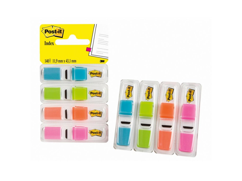 Úzke plnofarebné plastové priehľadné záložky v oddeliteľnom zásobníku. Použiteľné ako premiestniteľné zvýraznenie textu. Prelepiteľné, znovunalepiteľné a popisovateľné. Rozmery záložky 11,9 × 43,1 mm. 3 × 35 lístkov + 1 záložka zdarma.