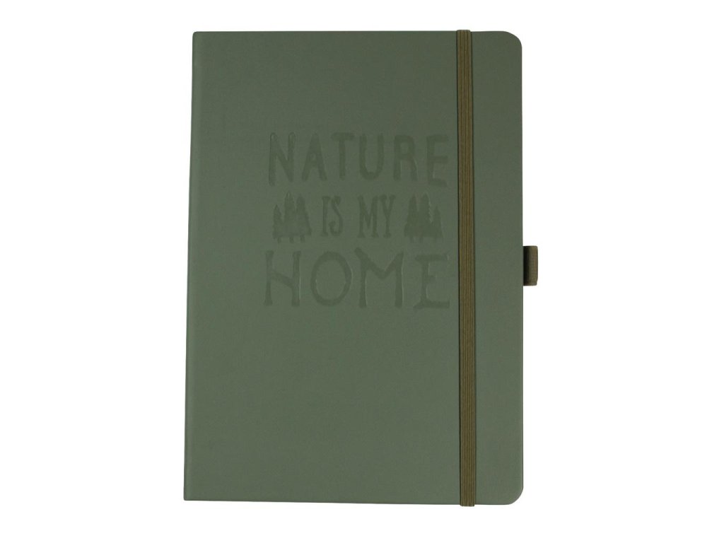 Zápisník outdoorový A5, štvorčekový. Vodoodolný obal s dizajnovým razením, 56 listov vodoodpudivého papiera, 120 g/m². S pútkom na pero, gumičkou a archívnym vreckom. Farba olivová.