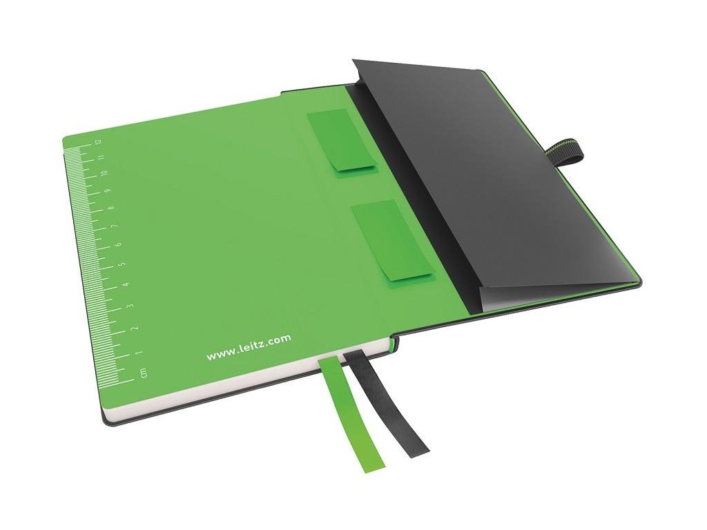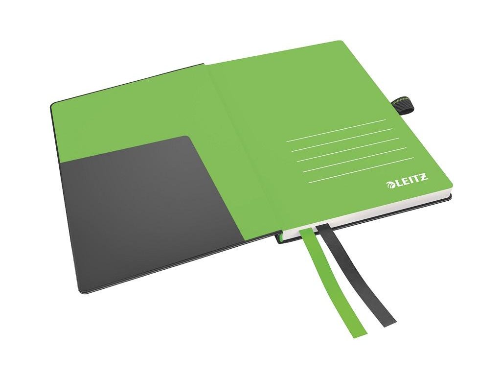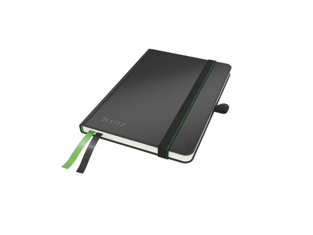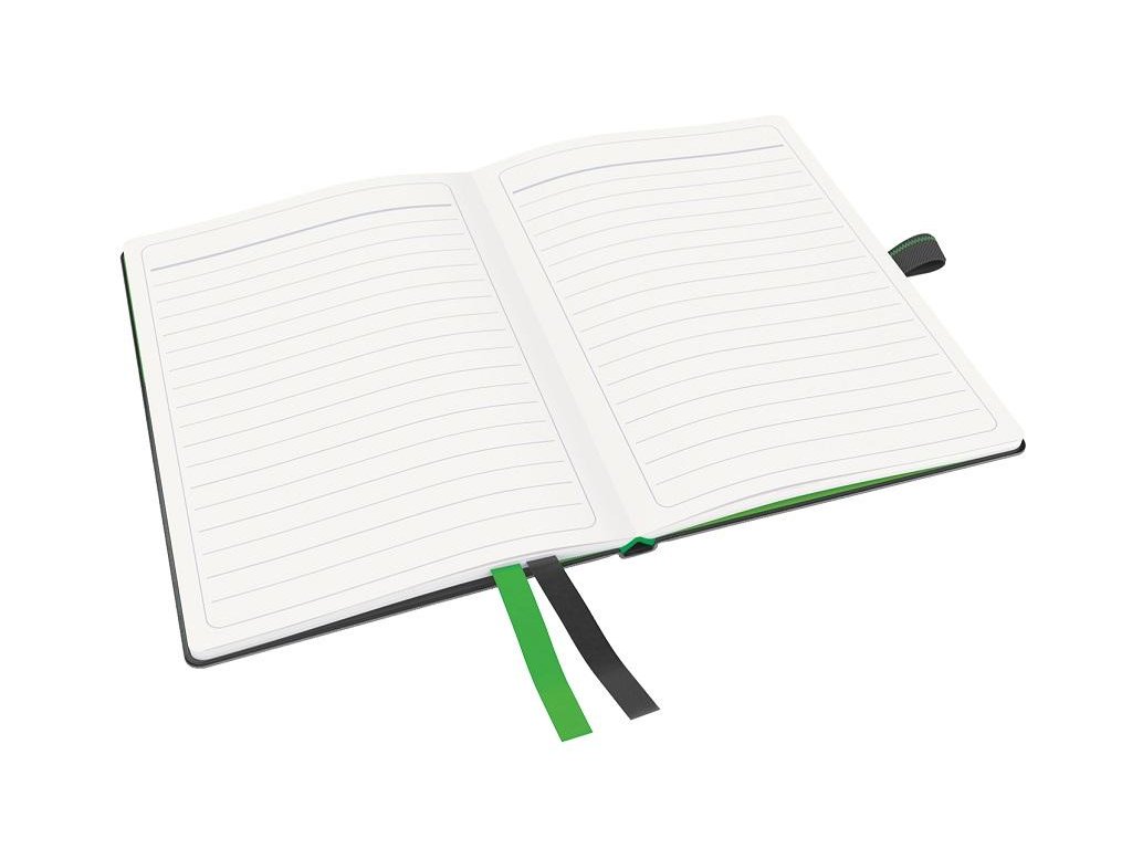 Zápisník s uzatváraním na gumičku s úchytom na pero a 2 textilnými záložkami. Posledných 8 strán perforovaných, samolepiace záložky na zadnej strane na označenie dôležitého obsahu, vnútorný obal s rozšíriteľnou kapacitou na prednej a zadnej strane na uloženie voľných listov. Materiál kožený vzhľad (syntetická koža). Formát A6.