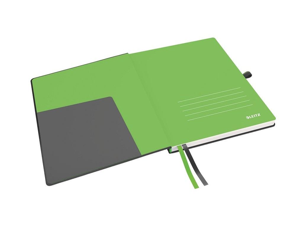 Zápisník s uzatváraním na gumičku s úchytom na pero a 2 textilnými záložkami. Posledných 8 strán perforovaných, samolepiace záložky na zadnej strane na označenie dôležitého obsahu, vnútorný obal s rozšíriteľnou kapacitou na prednej a zadnej strane na uloženie voľných listov. Materiál kožený vzhľad (syntetická koža). Formát iPad.
