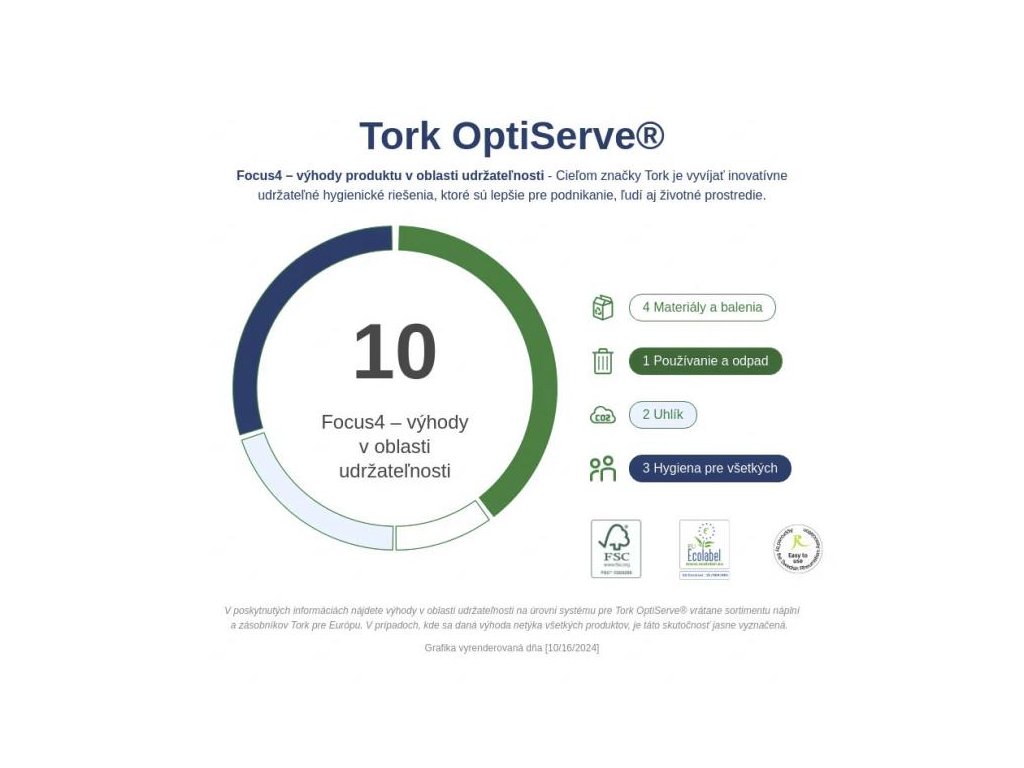 Tork OptiServe® je vysokokapacitný systém bezdutinkového toaletného papiera pre zariadenia, kde je kľúčová efektívnosť, udržateľnosť a poskytovanie skvelého zážitku. Je to lepšia alternatíva ako bežný toaletný papier a tradičné jumbo kotúče. Široká ponuka zásobníkov znamená, že rôzne potreby v rámci zariadenia možno uspokojiť jedným typom toaletného papiera. Tork OptiServe bezdutinkové kotúče majú 3x viac toaletného papiera, sú bez dutinky a krycej vrstvy papiera, vďaka čomu predstavujú menej odpadu v porovnaní s bežným toaletným papierom.