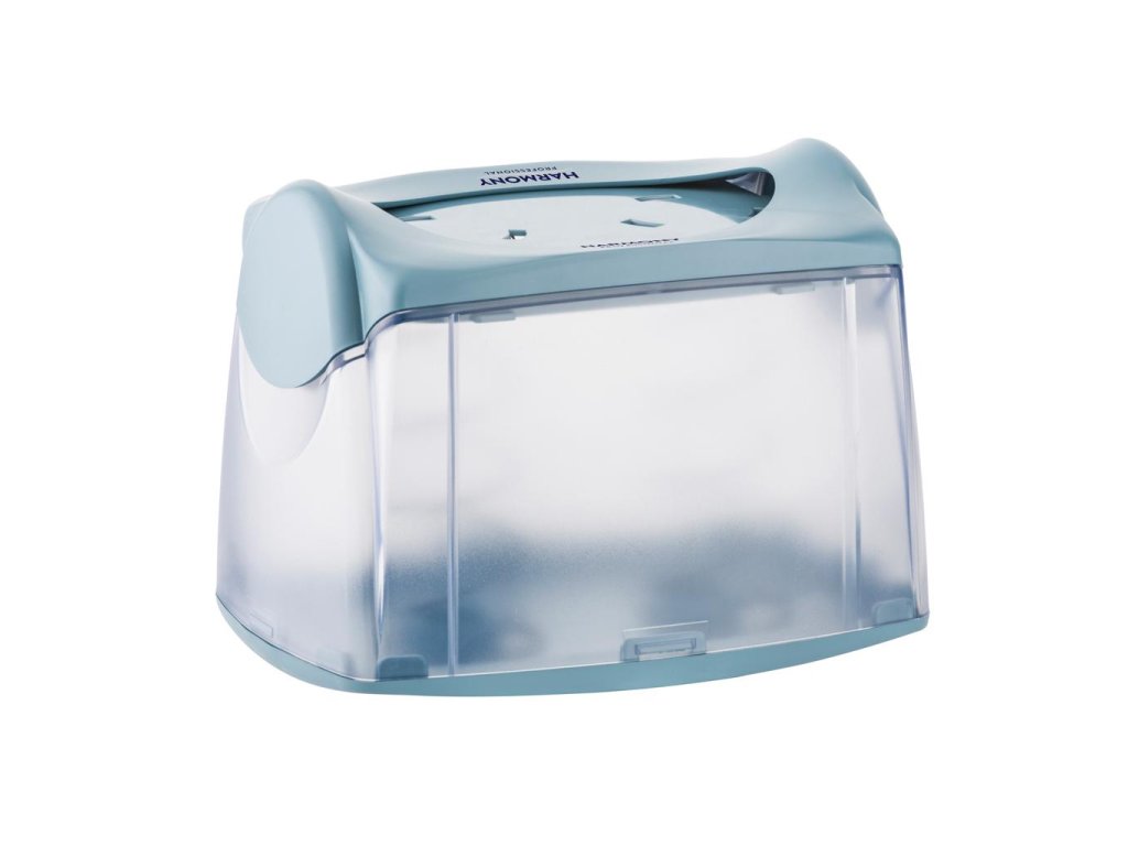 Zásobník HARMONY Professional na skladané servítky stolový malý. Voľne stojaci stolový zásobník z ABS plastu s pružinou, ktorá servítky posúva k otvoru na vyťahovanie. Uzamykateľný západkou. Kapacita 200 servítkov. Farba číra, kryt a podstavec tyrkysový.