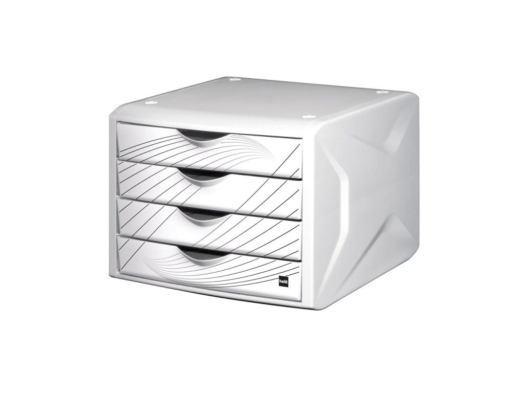 Stohovateľný box z odolného polypropylénu so štyrmi zatvorenými zásuvkami a dekoráciou na prednej strane zásuviek. Svieži dizajn. Rozmery (š × v × h) 262 × 212 × 330 mm.