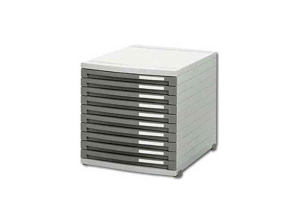Box z modulárneho systému zásuvkových boxov s horizontálnym aj vertikálnym spájaním. Model so zatvorenými zásuvkami (bez predného krytu) výšky 25 mm a zarážkou chrániacou zásuvky pred úplným vysunutím. Súčasťou sú identifikačné menovky na označenie zásuviek.Telo boxov vo svetlosivej farbe, zásuvky tmavosivé. Rozmery (š × v × h) 30 × 30,7 × 38,2 cm.
