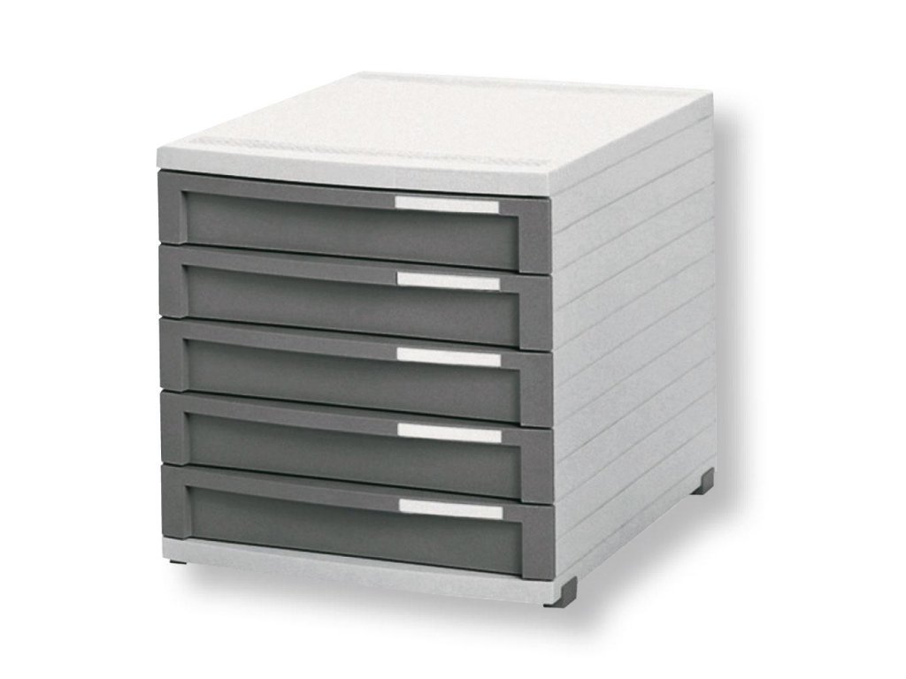 Box z modulárneho systému zásuvkových boxov s horizontálnym aj vertikálnym spájaním. Model so zatvorenými zásuvkami výšky 50 mm a zarážkou chrániacou zásuvky pred úplným vysunutím. Súčasťou sú identifikačné menovky na označenie zásuviek.Telo boxov vo svetlosivej farbe, zásuvky tmavosivé. Rozmery (š × v × h) 30 × 30,7 × 38,2 cm.