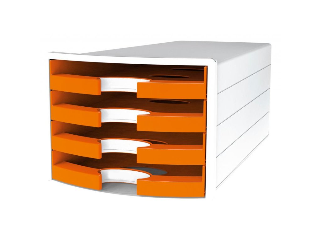 Box so štyrmi otvorenými zásuvkami v tvare počítačového monitora v trendových farbách. Rozmery (š × v × h) 294 × 235 × 368 mm. Farba oranžová.