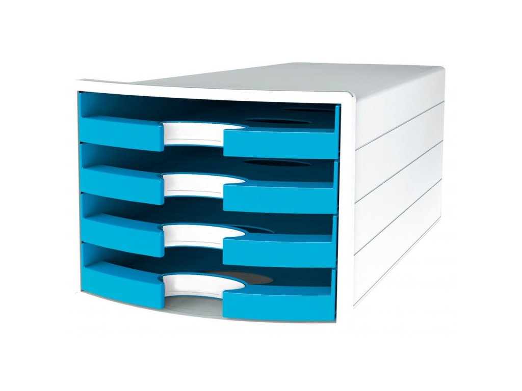 Box so štyrmi otvorenými zásuvkami v tvare počítačového monitora v trendových farbách. Rozmery (š × v × h) 294 × 235 × 368 mm. Farba svetlo modrá.