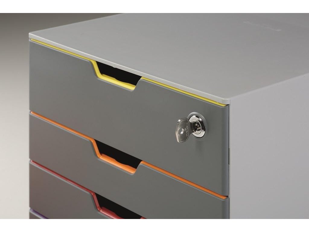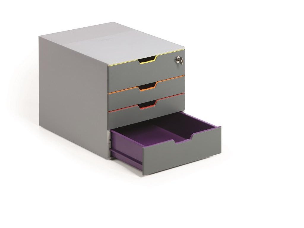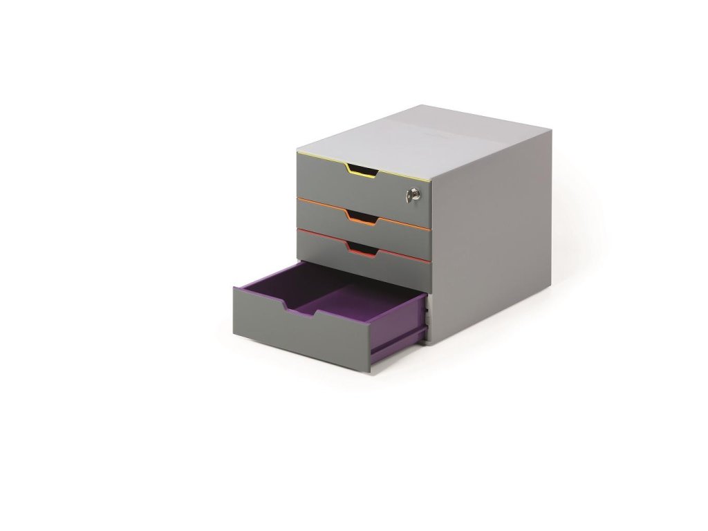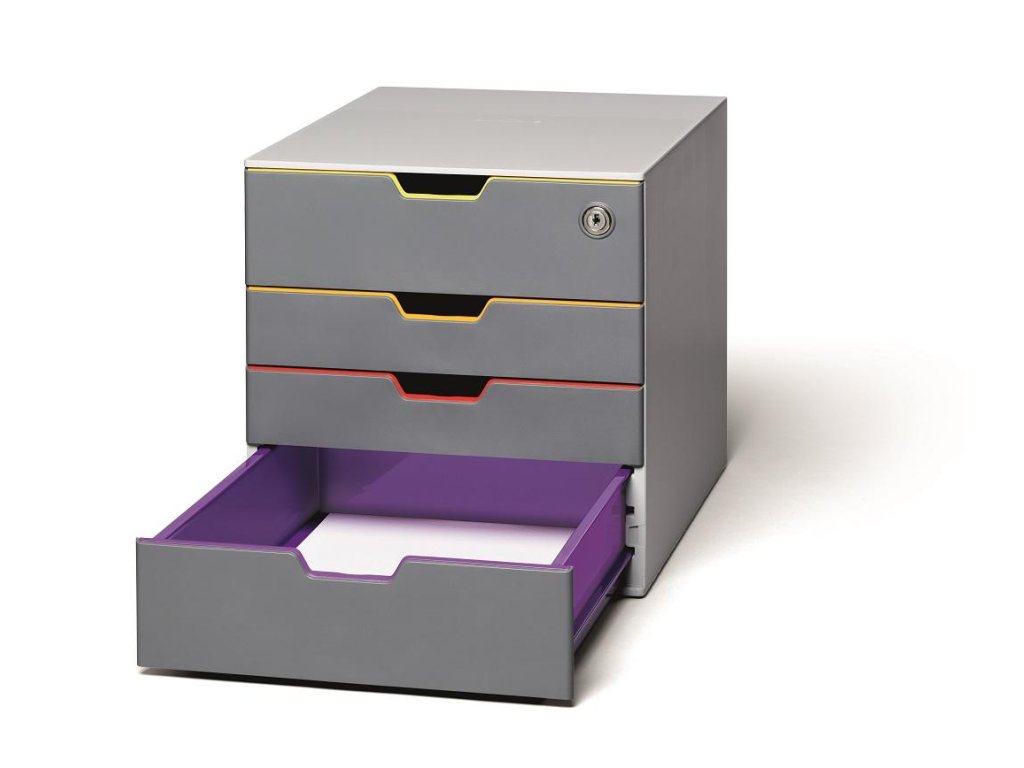 Box s cylindrickou vložkou, dodávaný s 2 kľúčami. 4 zatvorené zásuvky, vrchná a spodná zásuvka vo formáte XXL.