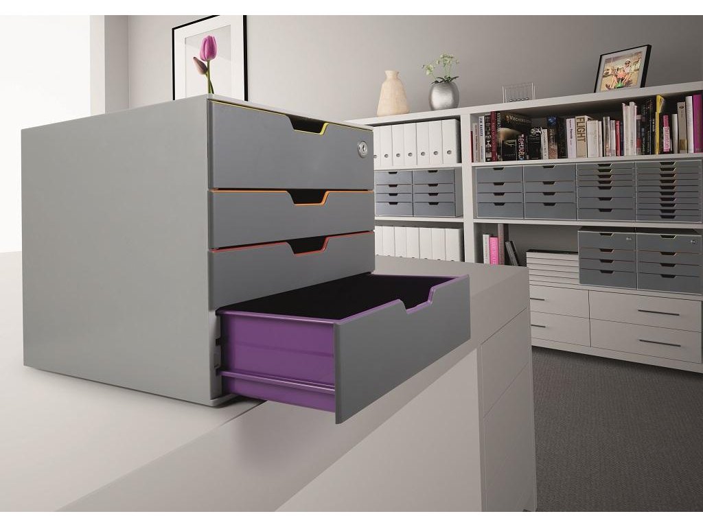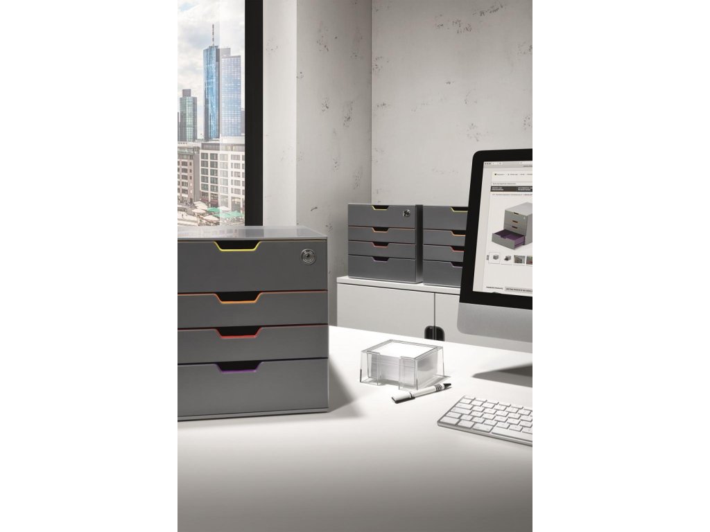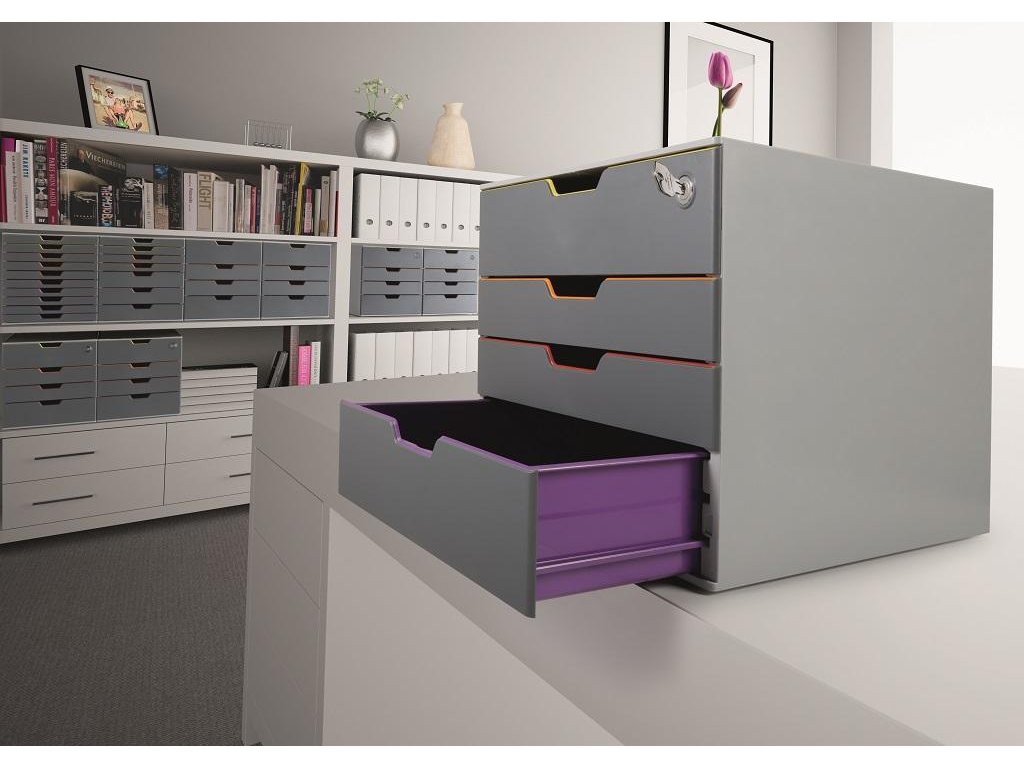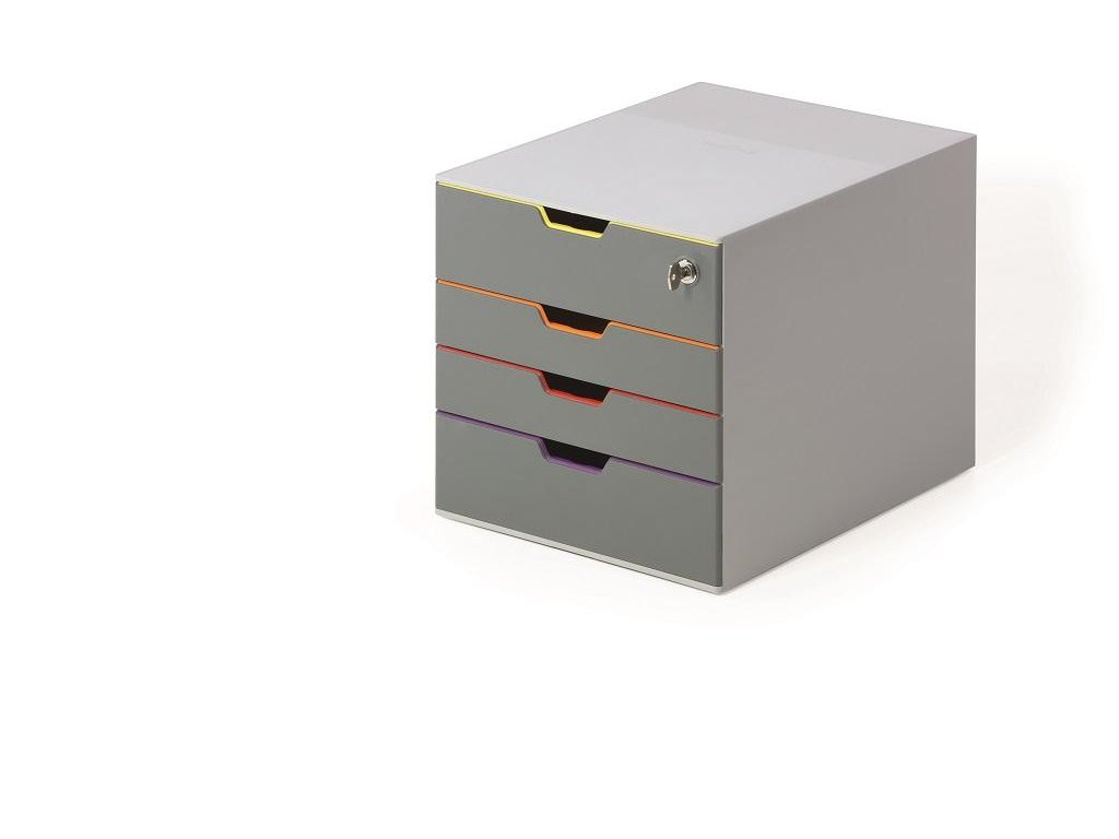 Box s cylindrickou vložkou, dodávaný s 2 kľúčami. 4 zatvorené zásuvky, vrchná a spodná zásuvka vo formáte XXL.