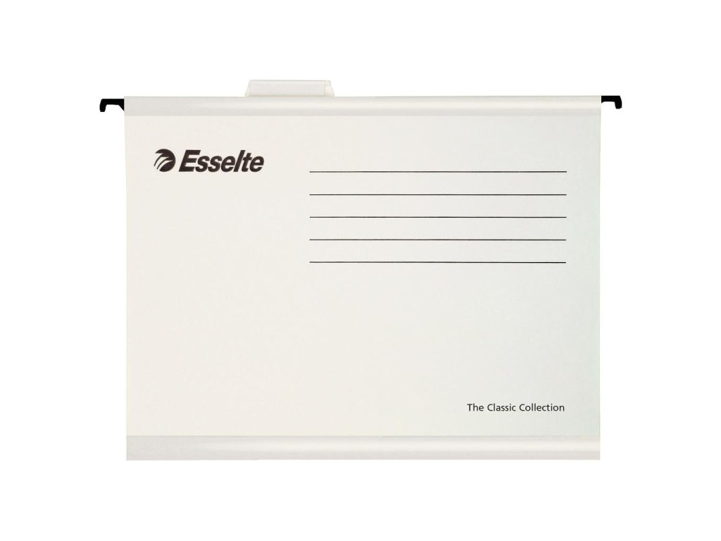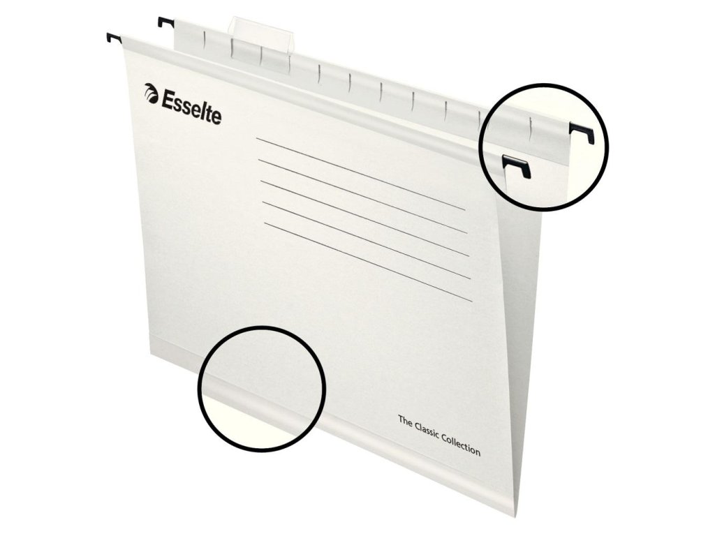 Závesné obaly Esselte kolekcie Classic vyrobené z pevného kartónu. Lisované dno obalu dovoľuje zvýšiť kapacitu na 30 mm. Súčasťou obalu je násuvný index z priehľadného plastu s výmenným papierovým štítkom. Formát A4, rozpätie vodiacich líšt 330 mm.