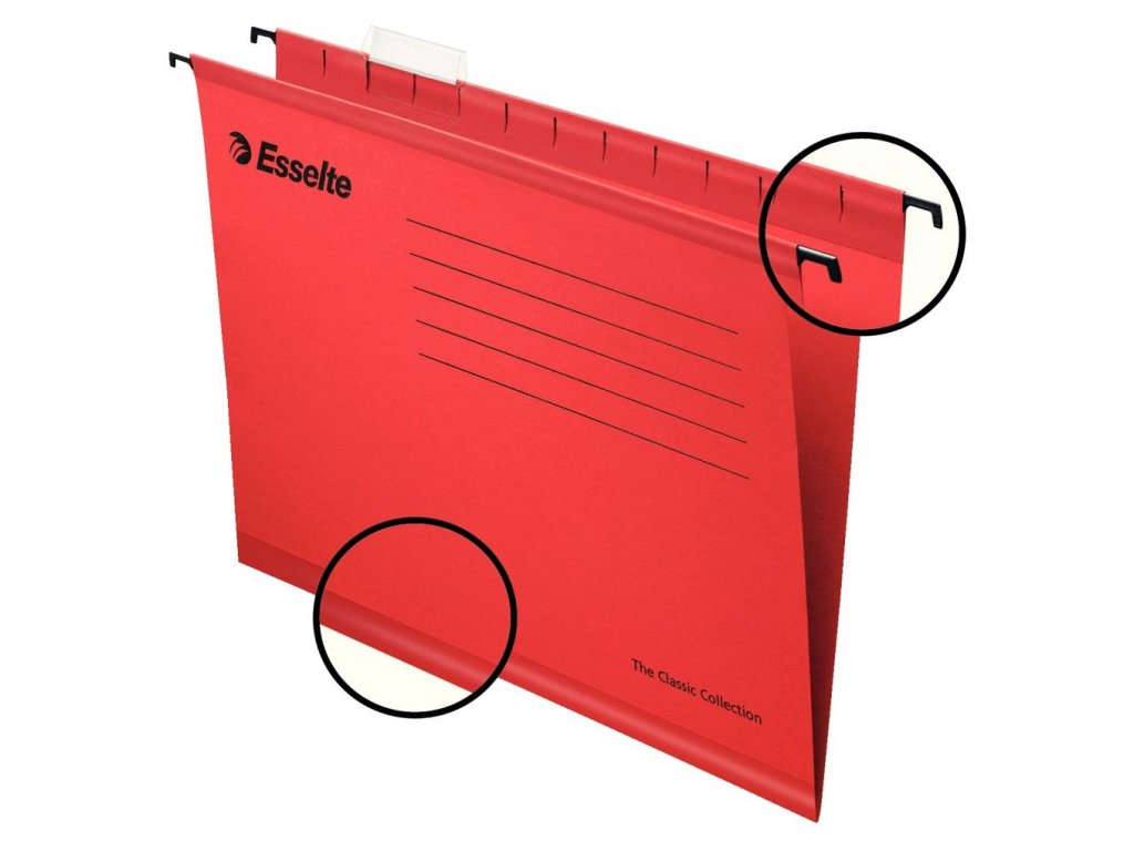 Závesné obaly Esselte kolekcie Classic vyrobené z pevného kartónu. Lisované dno obalu dovoľuje zvýšiť kapacitu na 30 mm. Súčasťou obalu je násuvný index z priehľadného plastu s výmenným papierovým štítkom. Formát A4, rozpätie vodiacich líšt 330 mm.
