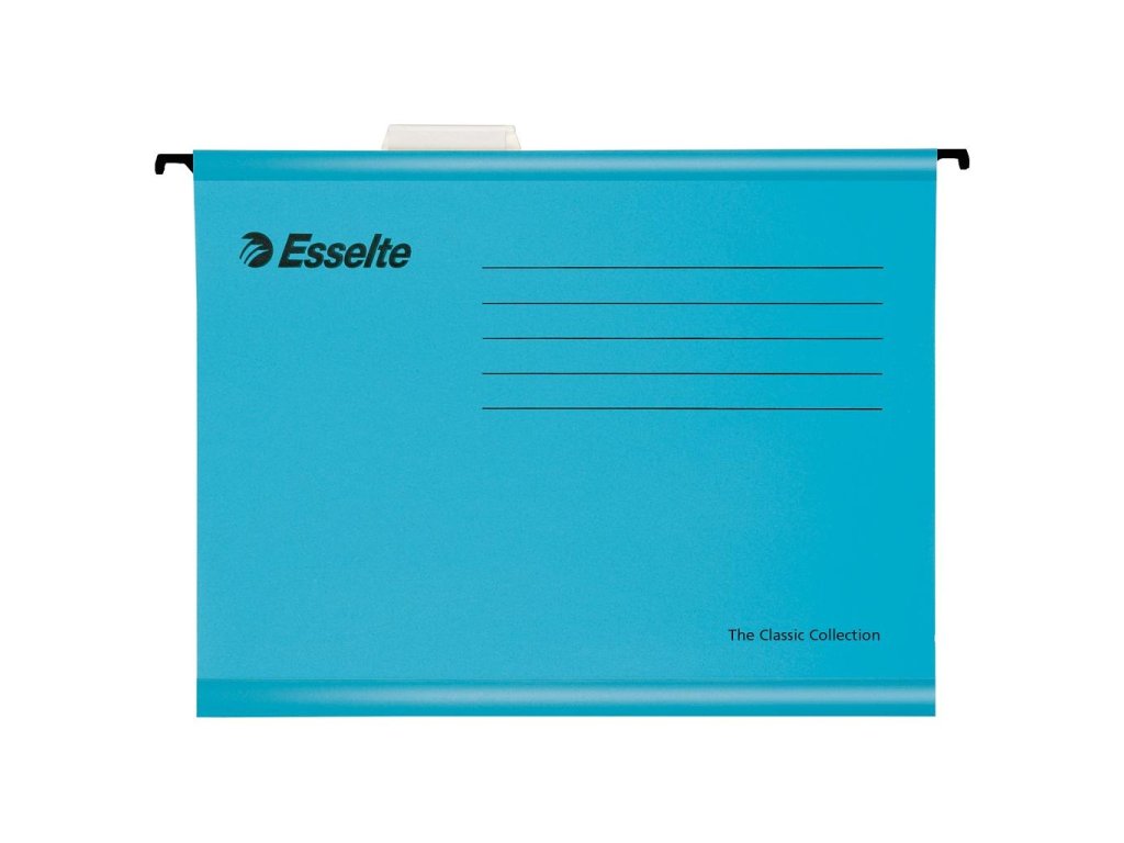 Závesné obaly Esselte kolekcie Classic vyrobené z pevného kartónu. Lisované dno obalu dovoľuje zvýšiť kapacitu na 30 mm. Súčasťou obalu je násuvný index z priehľadného plastu s výmenným papierovým štítkom. Formát A4, rozpätie vodiacich líšt 330 mm.
