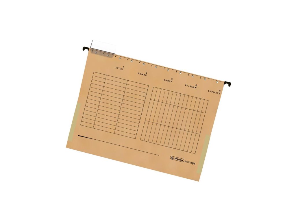 Závesné obaly z recyklovaného kartónu Manila gramáže 230 g / m² s indexom z priehľadného plastu s výmenným papierovým štítkom. Rozpätie vodiacich líšt 330 mm. Farba hnedá. Balenie 5 ks.