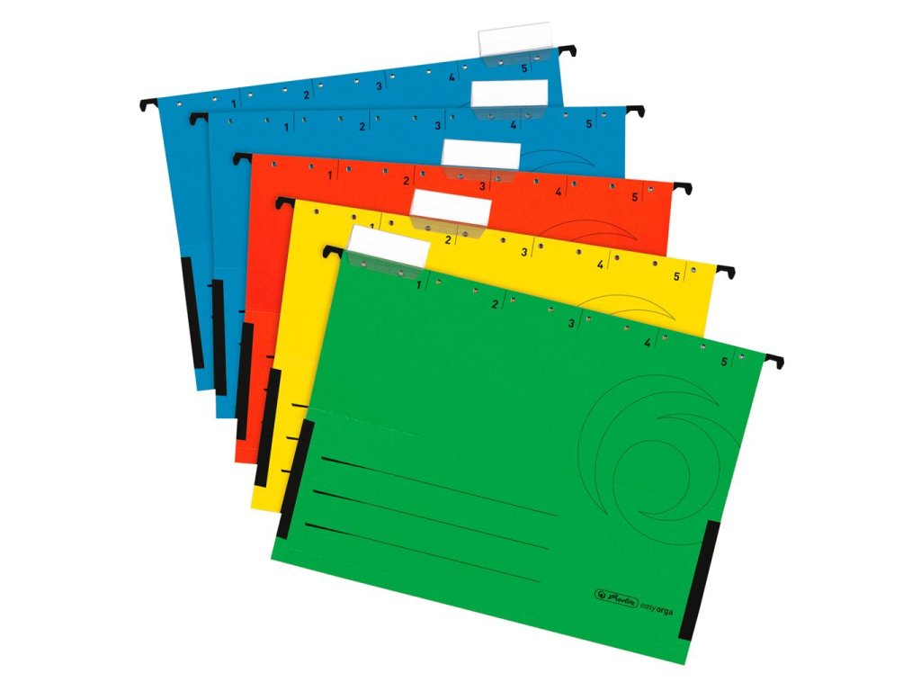 Závesné obaly z recyklovaného kartónu Manila gramáže 230 g / m² s indexom z priehľadného plastu s výmenným papierovým štítkom. Rozpätie vodiacich líšt 330 mm. Farba mix. Balenie 5 ks. Závesné obaly v mixe červenej, modrej a žltej farby.