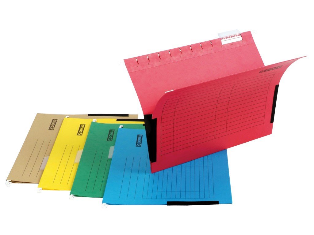 Závesný obal na zakladanie voľných listov do formátu A4. Plátené bočnice zabraňujú vypadnutiu dokumentov z obalov, kovové závesné háčiky garantujú dlhodobé používanie. Súčasťou obalu je plastový index a papierový štítok.