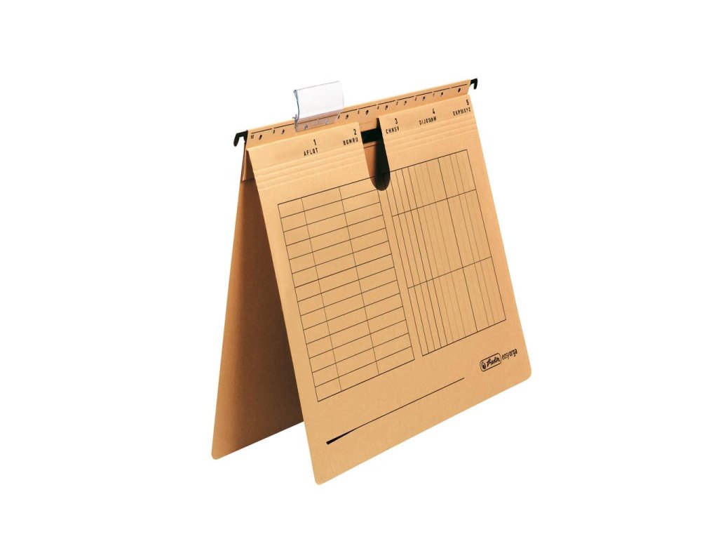 Závesné obaly z recyklovaného kartónu Manila gramáže 230 g / m² s indexom z priehľadného plastu s výmenným papierovým štítkom. Rozpätie vodiacich líšt 330 mm. Farba hnedá. Balenie 5 ks.