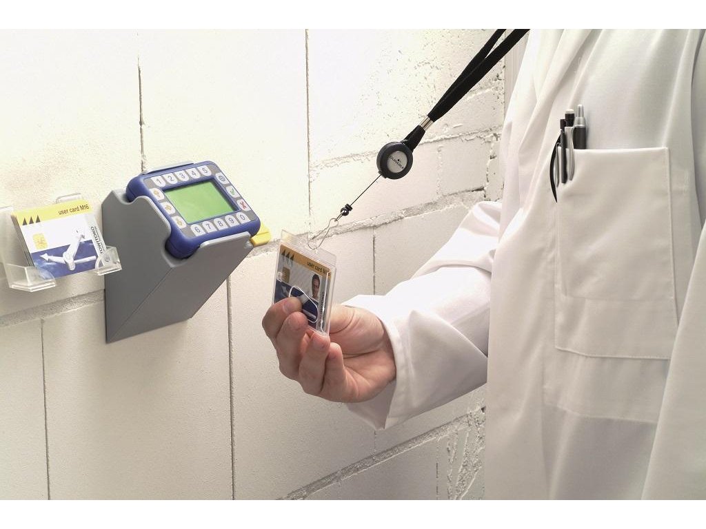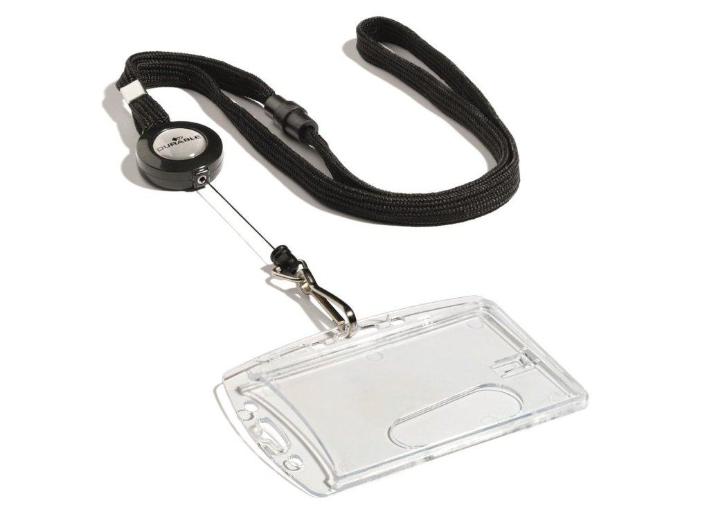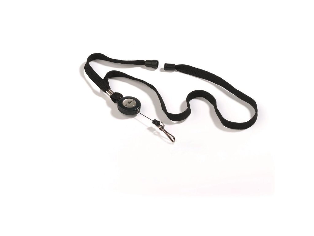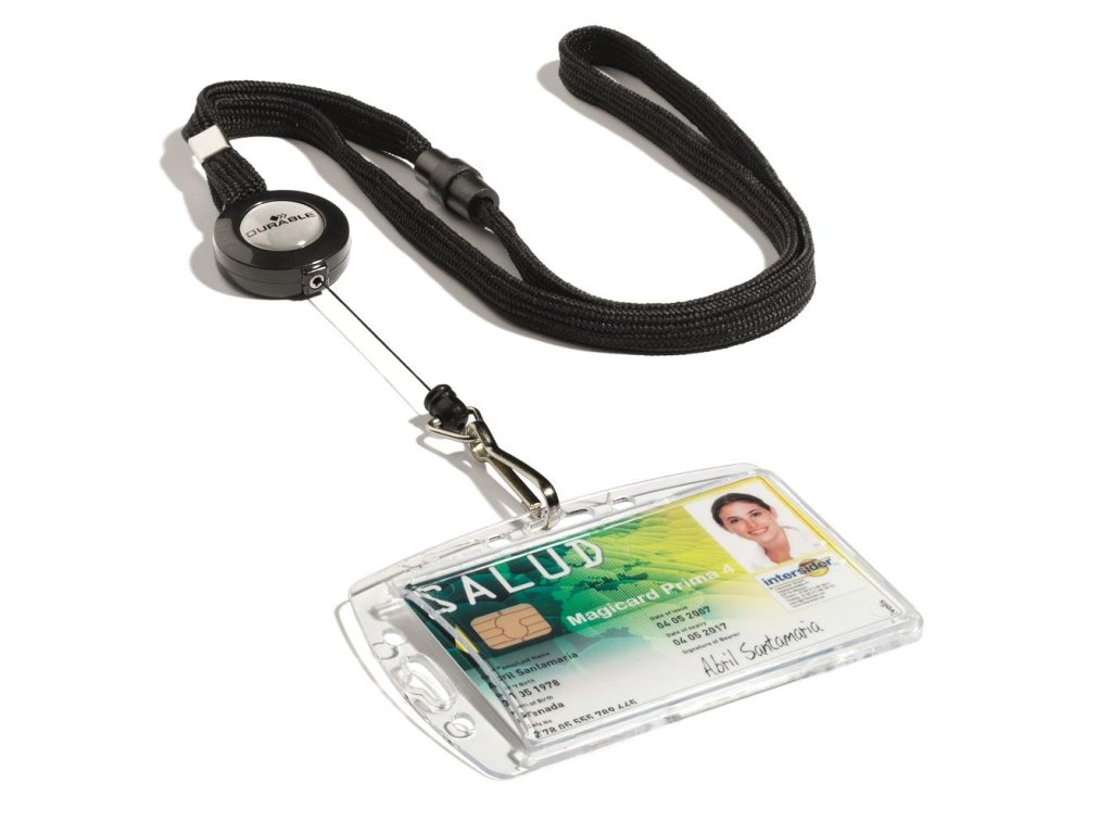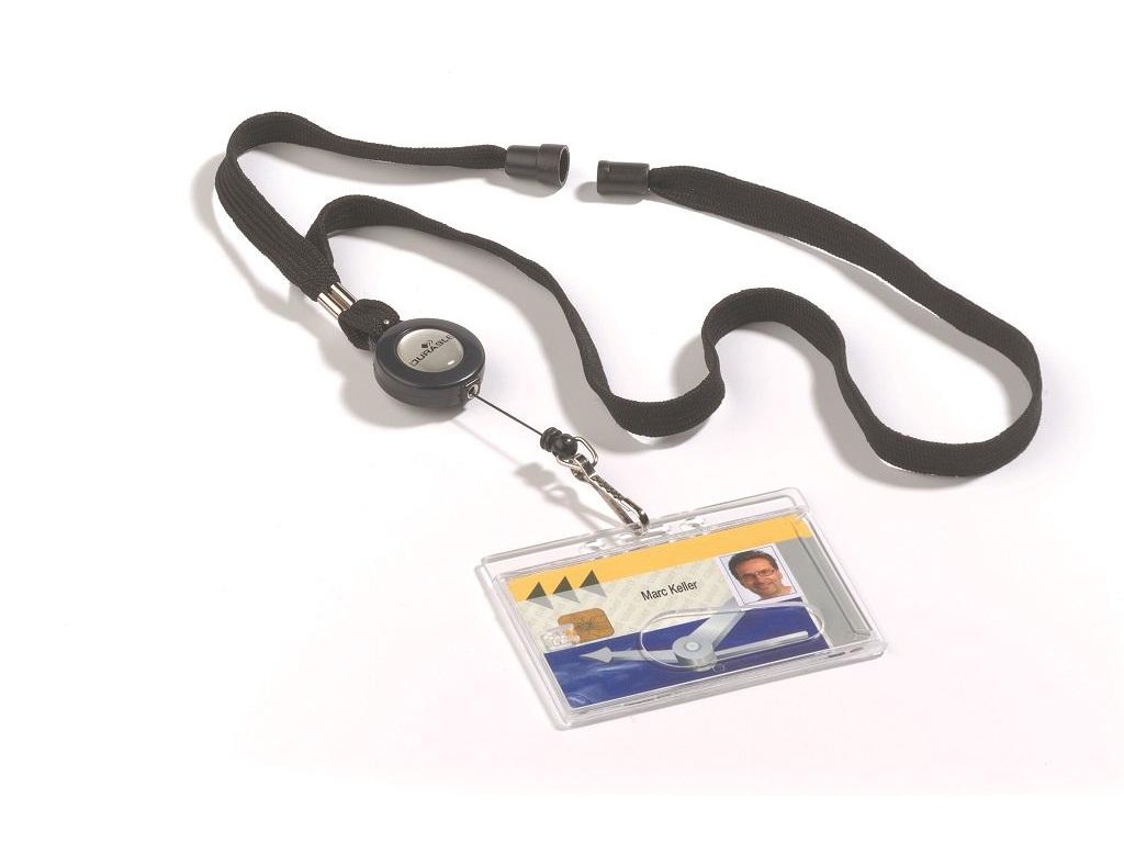 Kombinácia výsuvného kotúča a remienka na krk šírky 10 mm s bezpečnostnou poistkou, ktorá sa uvoľní pri zachytení remienka alebo pri silnom potiahnutí. Vďaka tomuto spôsobu uchytenia je možné s kartou pohodlne manipulovať. Vysunutie kotúča do 80 cm, remienok dĺžky 44 cm. Balenie 10 ks.