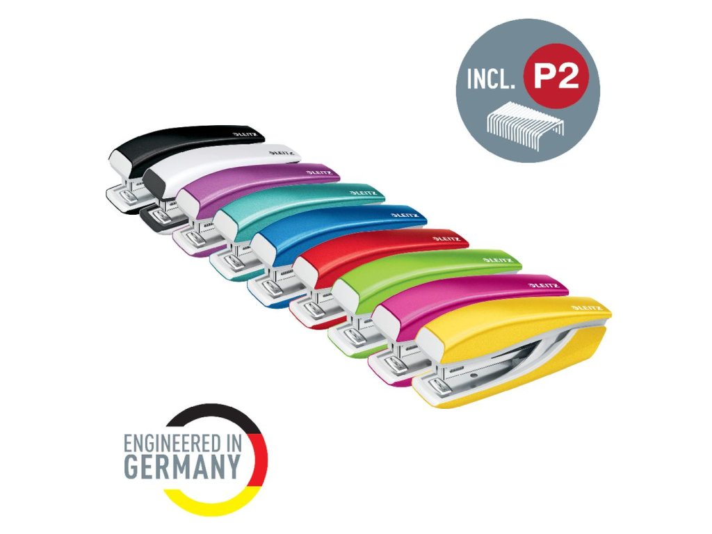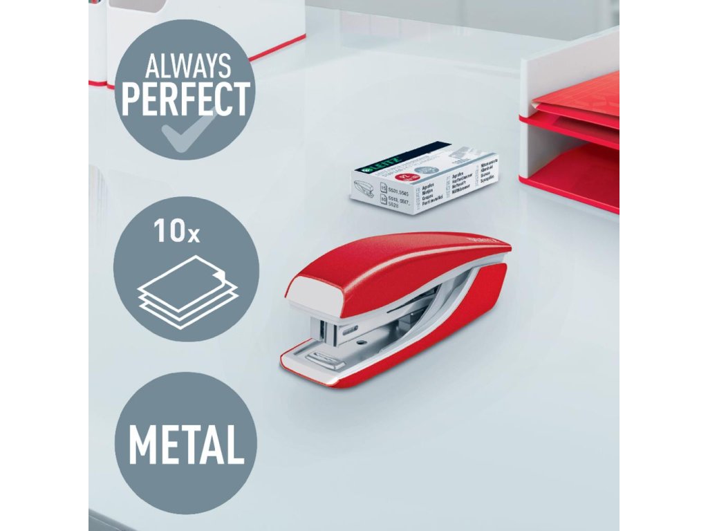 Malá zošívačka v moderných žiarivých farbách ideálna nielen do kancelárie, ale aj domov alebo na cesty. Vždy perfektné zošitie vďaka patentovanej technológii DIT. V kombinácii so spinkami Leitz Power Performance P2 (č. 10) dosiahnete vždy jednoduché a správne zošitie. Kapacita 10 hárkov. Vrecková zošívačka. Patentovaná technológia DIT na spoľahlivé zošívanie. Balenie v škatuľke, vrátane spiniek. Otvorením ramena o 180° je možné použiť nástenkové zošívanie (takrovanie). Farba červená.