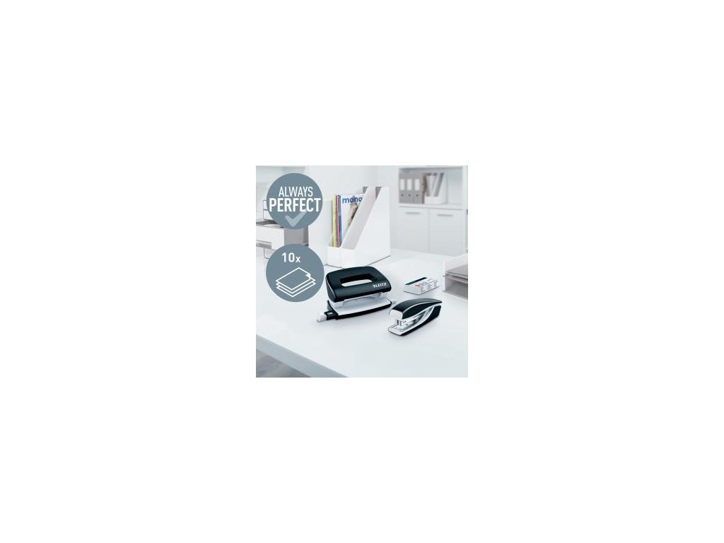 Malá zošívačka v moderných žiarivých farbách ideálna nielen do kancelárie, ale aj domov alebo na cesty. Vždy perfektné zošitie vďaka patentovanej technológii DIT. V kombinácii so spinkami Leitz Power Performance P2 (č. 10) dosiahnete vždy jednoduché a správne zošitie.Kapacita 10 hárkov. Vrecková zošívačka. Patentovaná technológia DIT na spoľahlivé zošívanie. Balenie v škatuľke, vrátane spiniek. Otvorením ramena o 180° je možné použiť nástenkové zošívanie (takrovanie). Farba čierna.