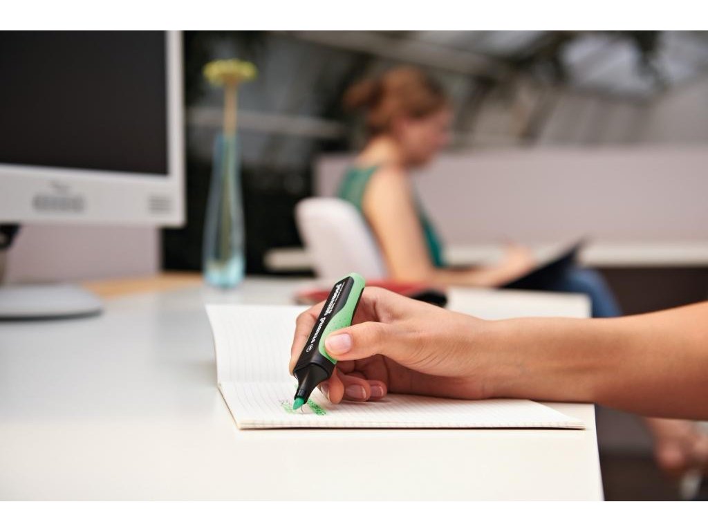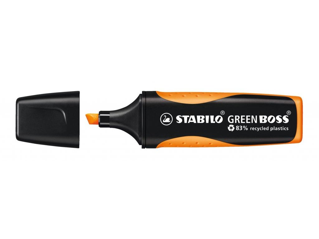 STABILO GREEN BOSS. Zvýrazňovač vyrobený z 83% recyklovaného plastu pre školákov, študentov, učiteľov a zamestnancov kancelárie, ktorí sú ohľaduplní k životnému prostrediu. Štýlový dizajn s protišmykovou zónou úchopu. Technológia STABILO Anti-Dry-Out chráni pred vysychaním po dobu 4 hodín a zaisťuje koncentrovanú prácu. Zvýrazňovač je možné ľahko a pohodlne doplniť náplňami STABILO BOSS ORIGINAL. Atrament na vodnej báze. 2 šírky stopy 2 + 5 mm. Farba oranžová. Väčšie balenie 10 kusov.