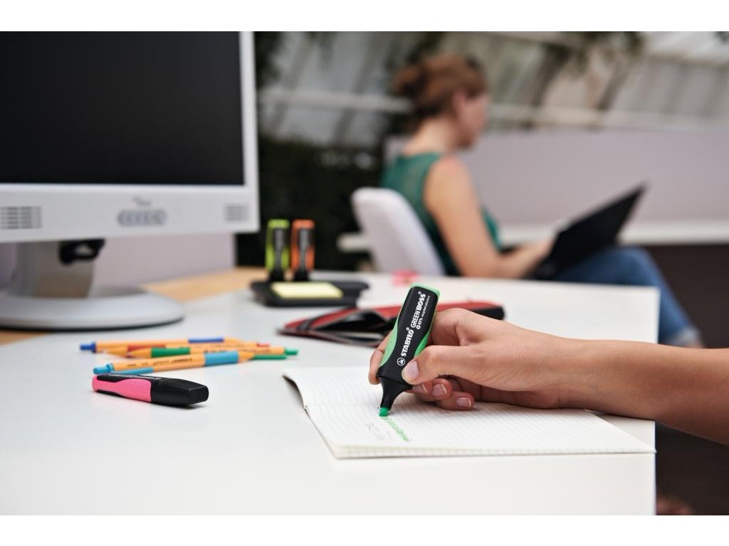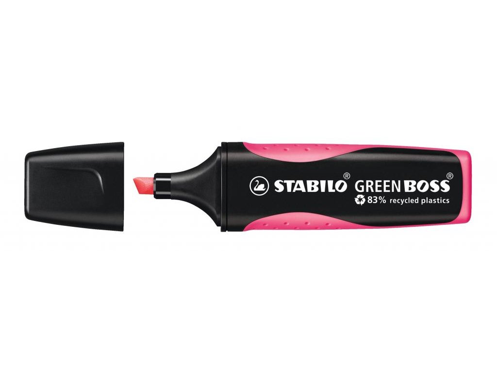 STABILO GREEN BOSS. Zvýrazňovač vyrobený z 83% recyklovaného plastu pre školákov, študentov, učiteľov a zamestnancov kancelárie, ktorí sú ohľaduplní k životnému prostrediu. Štýlový dizajn s protišmykovou zónou úchopu. Technológia STABILO Anti-Dry-Out chráni pred vysychaním po dobu 4 hodín a zaisťuje koncentrovanú prácu. Zvýrazňovač je možné ľahko a pohodlne doplniť náplňami STABILO BOSS ORIGINAL. Atrament na vodnej báze. 2 šírky stopy 2 + 5 mm. Farba ružová. Väčšie balenie 10 kusov.